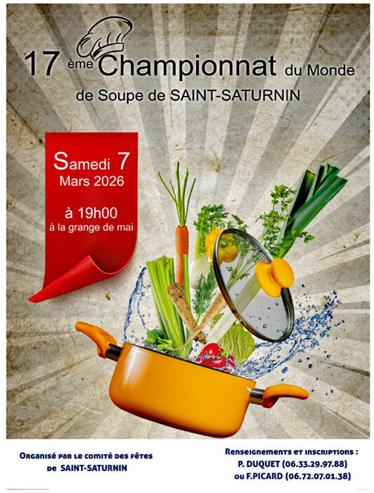 Le « Championnat du monde de soupe » de Saint-Saturnin (63450, Puy-de-Dôme) est bien un événement récurrent organisé par le comité des fêtes, mais je ne trouve pas de confirmation officielle d’une édition précisément datée au samedi 7 mars 2026.