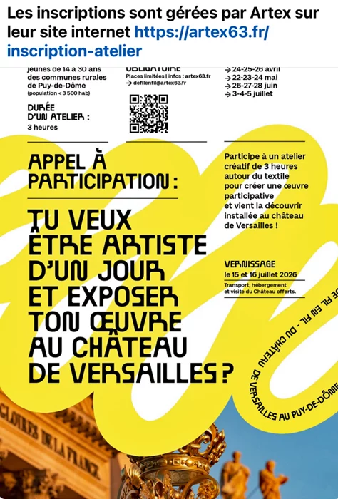 Il s’agit d’un projet de création textile collective. L’objectif est de réaliser une œuvre d’art contemporaine à laquelle participent des jeunes du Puy-de-Dôme. Cette œuvre sera ensuite transportée et exposée directement au Château de Versailles durant l’été 2026.
